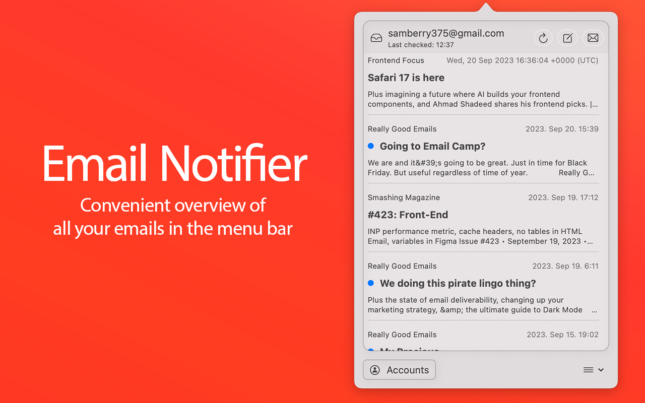 - Access your recent emails with a simple click on the menu bar